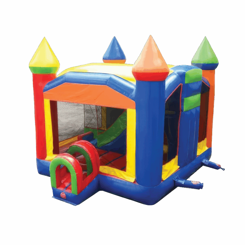 Nothing says fun times at an event or party like the traditional bounce house. Kids love them and parents do too. What could be better than showing up at an event and seeing the bright rainbow colors and tall castle peaks of the Rainbow Castle Bounce House? This inflatable bounce house is a wonderful addition to all children’s parties and events. This bounce house offers hours of jumping, skipping, and bouncing fun and entertainment. Multiple children can jump around in the Rainbow Castle Bounce House at the same time, allowing it to keep a large number of kids entertained at gatherings. The large enclosed bounce area is 14′ x 13′, offering plenty of room to move around and have a great time. It even has a basketball hoop inside the bouncing area for extra fun!